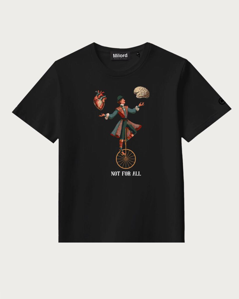 “La nostra essenza è racchiusa in un simbolo: la bombetta. Icona dell’eleganza inglese, ma anche manifesto di anticonformismo. Un segno distintivo che non omaggia solo il passato, ma lo reinterpreta con spirito libero e sguardo proiettato al futuro. Ogni capo Milord nasce da una continua ricerca: tessuti, grafiche, finiture e dettagli che raccontano una storia fatta di gusto, ironia e carattere.