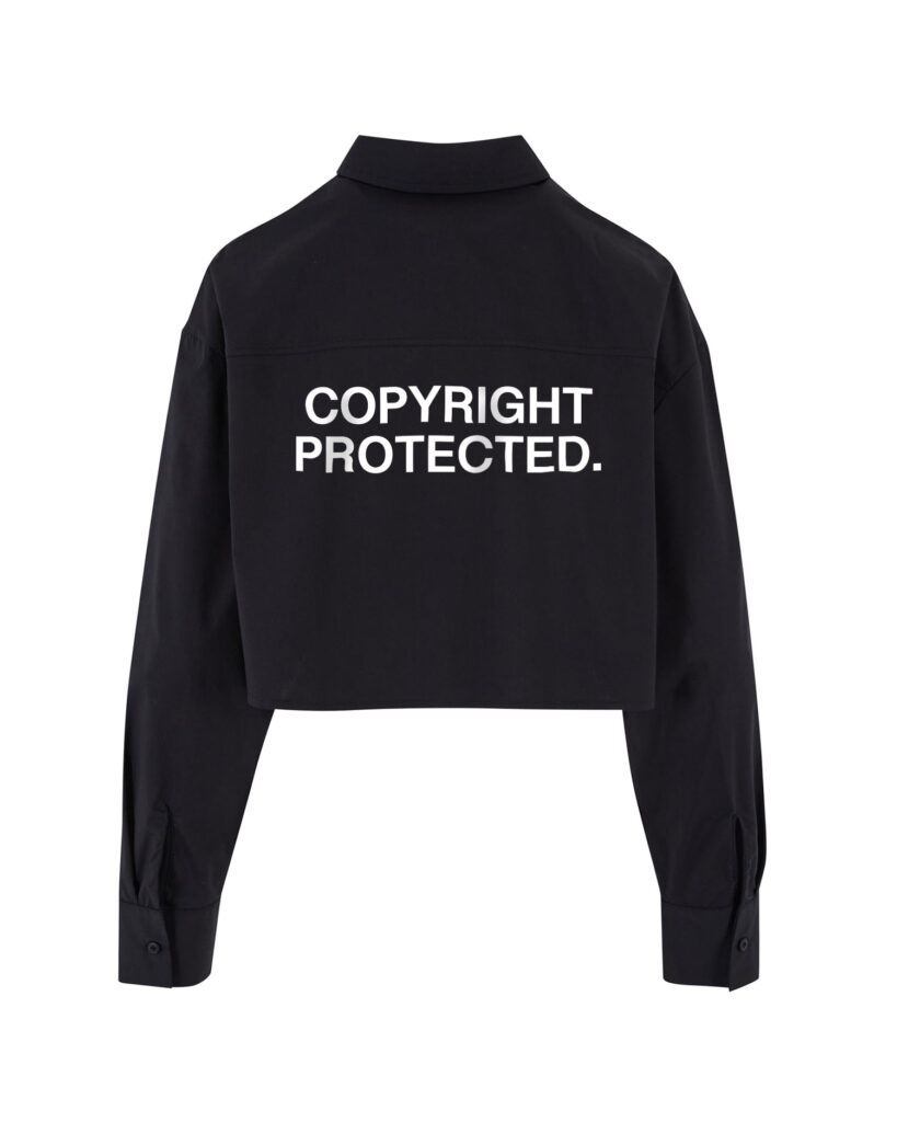 La vestibilità oversize con spalle scese crea una silhouette decisa e attuale, perfettamente bilanciata dal tessuto in popeline leggero, fresco e piacevole sulla pelle. Sul retro, la scritta “COPYRIGHT PROTECTED” diventa protagonista assoluta: un segno grafico forte, manifesto di identità e attitudine indipendente.