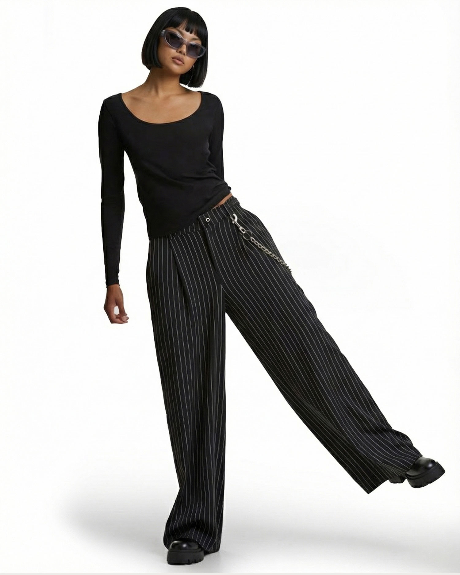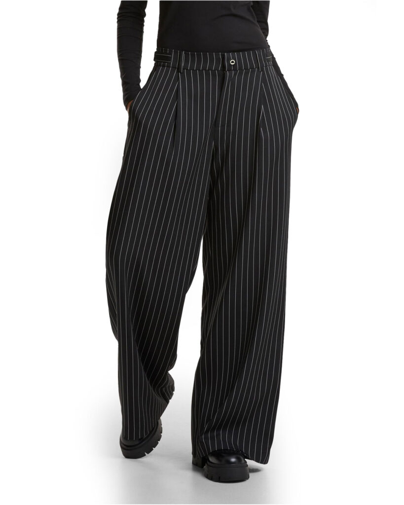 Un’icona rivisitata in chiave moderna. Questi pantaloni gessati da donna uniscono il fascino sartoriale del completo classico a una silhouette attuale e decisa. Il taglio wide leg crea volume e movimento, slanciando la figura e regalando un’eleganza naturale dal forte carattere urbano. Perfetti con una camicia per un look power-chic, irresistibili con un top minimal e anfibi per un outfit più fashion. Un pantalone versatile, pensato per chi ama distinguersi con stile, dal giorno alla sera.