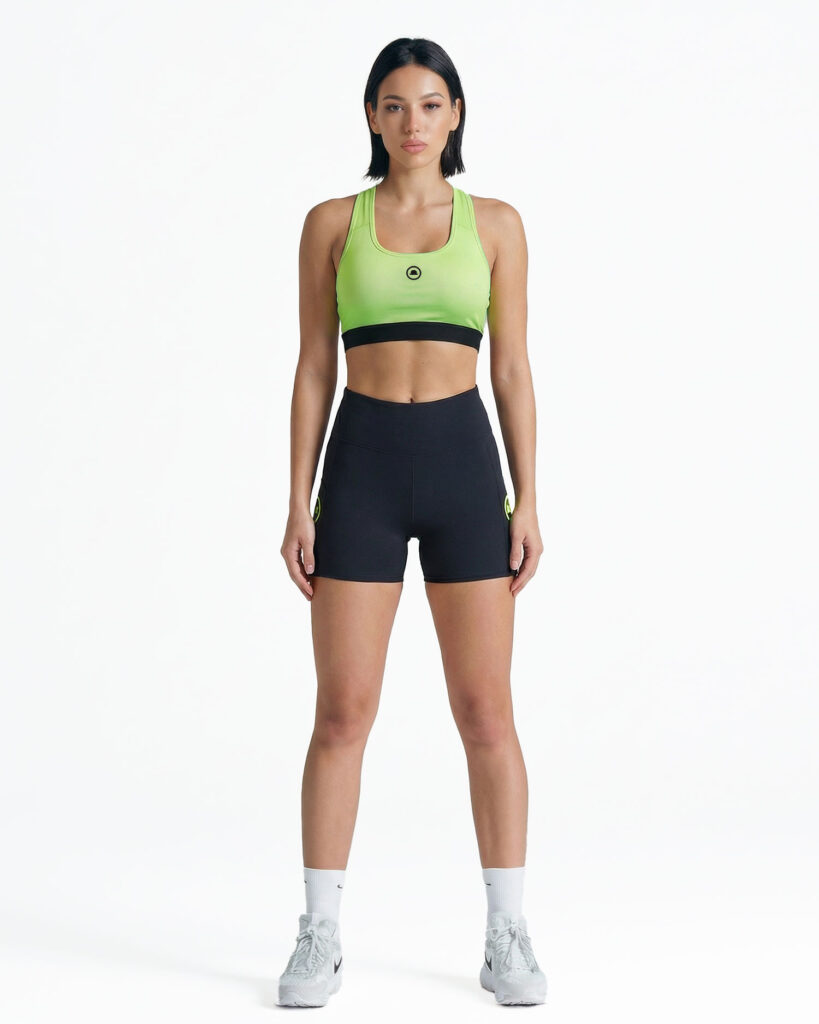 Set Milord 4FIT composto da sports bra e shorts coordinati. Top sportivo color lime ha l’imbottitura removibile. Shorts con doppio logo laterale e comoda tasca laterale per lo smartphone
