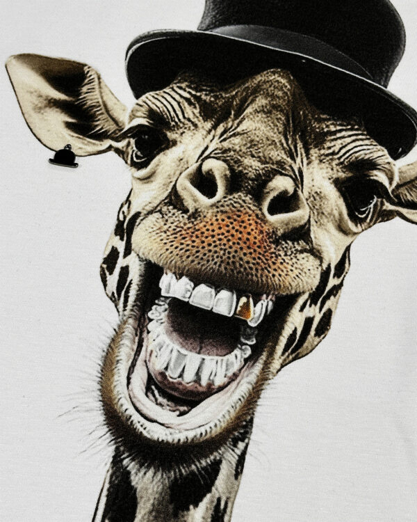 T-shirt esclusiva con stampa digitale: una giraffa che ride, completa di bombetta e un raffinato orecchino metallico pendente a forma di logo Milord. Un design originale che unisce stile e carattere